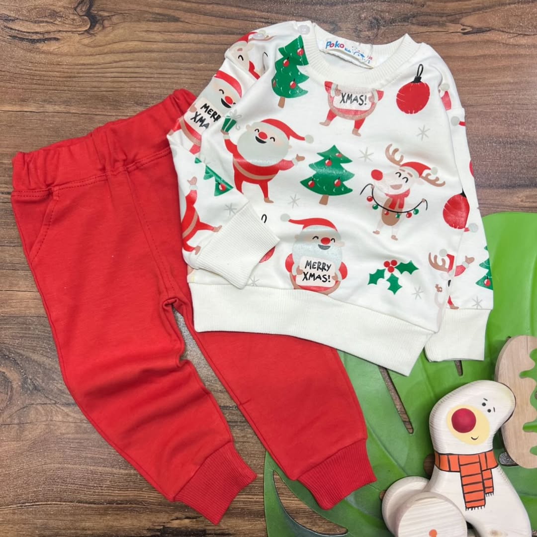 بلوز شلوار نخیپنبهای طرح بابانوئل سایز ۳–۶ ماه